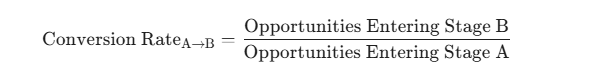 Use your CRM to pull a report detailing how many opportunities successfully move from stage A to stage B, stage B to stage C, and so on, using the formula:
